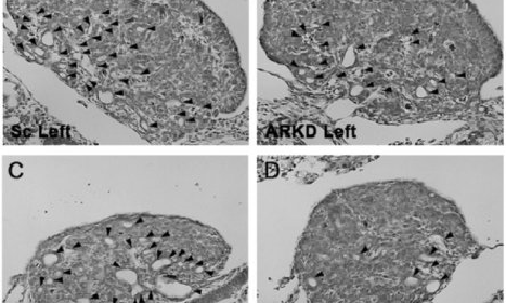 Left and right gonad tissues from the embryos 8.5 days after incubation. The number of cavities (lacunae, represented as arrowheads) is reduced in the AR knockdown embryos (B, D) compared to the control embryos (A, C). The scale bar is 100um.